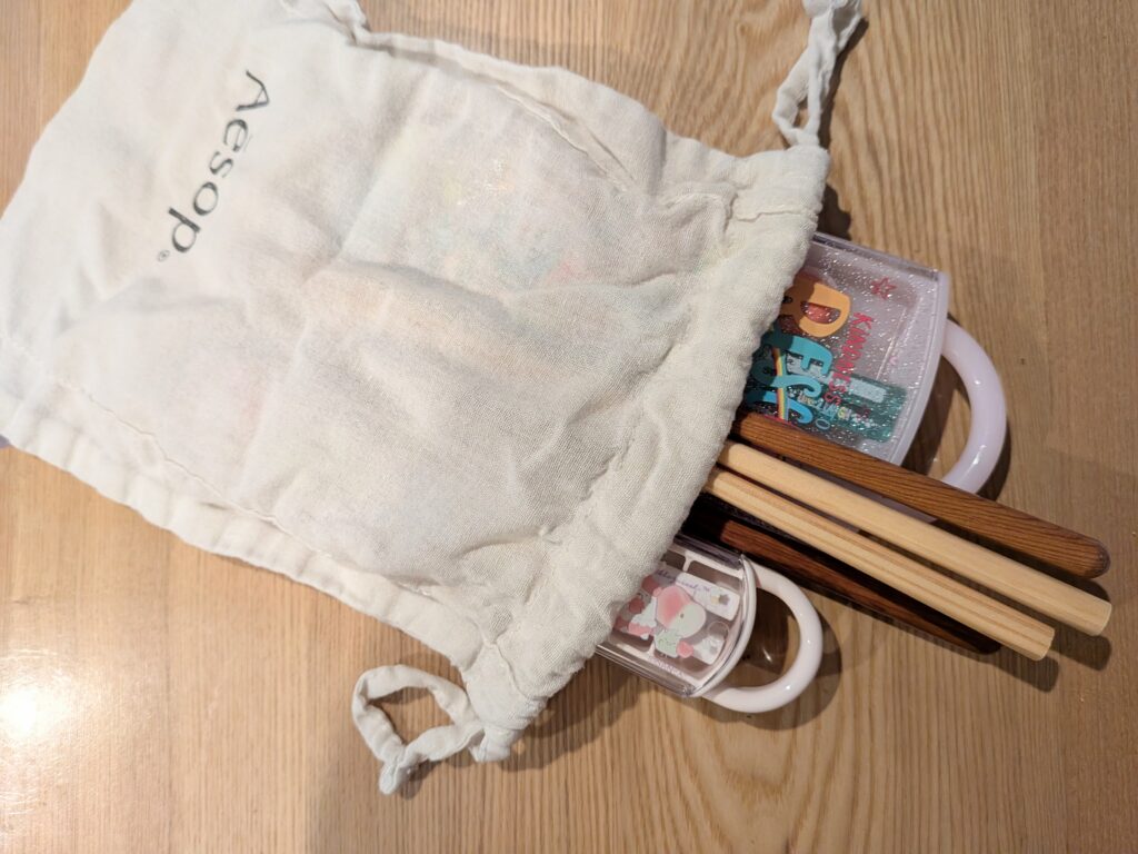 出かける時、カバンにカトラリーセットを入れた巾着を忍ばせる。この小さな積み重ねが数年単位で習慣となったら、、、実は大きな変化に繋がると思っている。